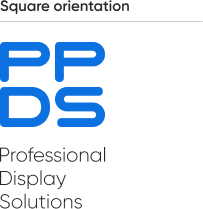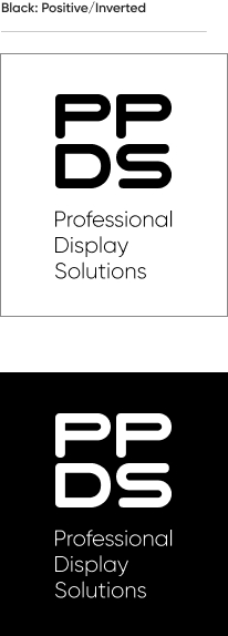 Professional Display Solutions is the descriptor that completes the wordmark. The main versions and the basic colour combination are described below.